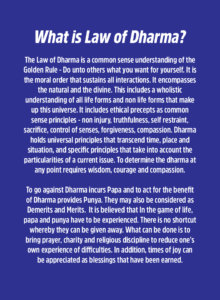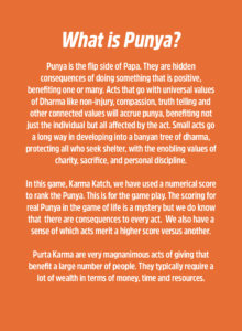 Karma Katch explores the Law of Dharma and Karma through the lens of accruing Papa and Punya. The opportunity to make dharmic decisions happen daily, in small and big measures. This amazing game has an additional set of Education cards on the terms used, a very useful resource.